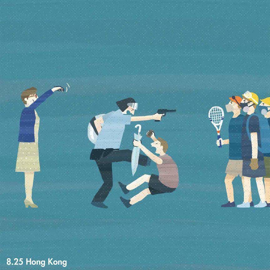 InkSundae自香港6月社運起,即有繪製很多畫作,幅幅精彩,難以盡述。這幅畫作一目了然,又有多重的社會含義,一針見血地刺出當權者的荒謬,是我最喜歡的作品。