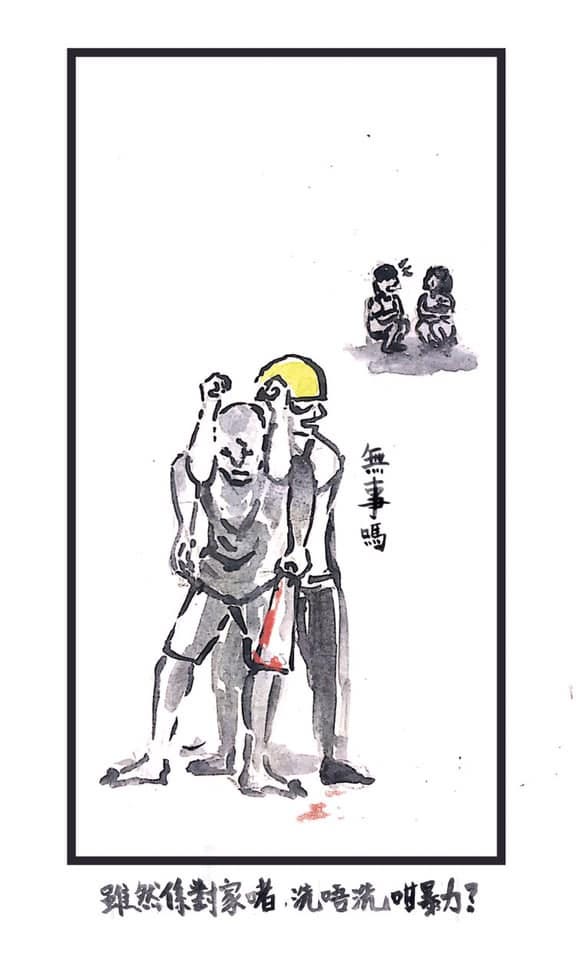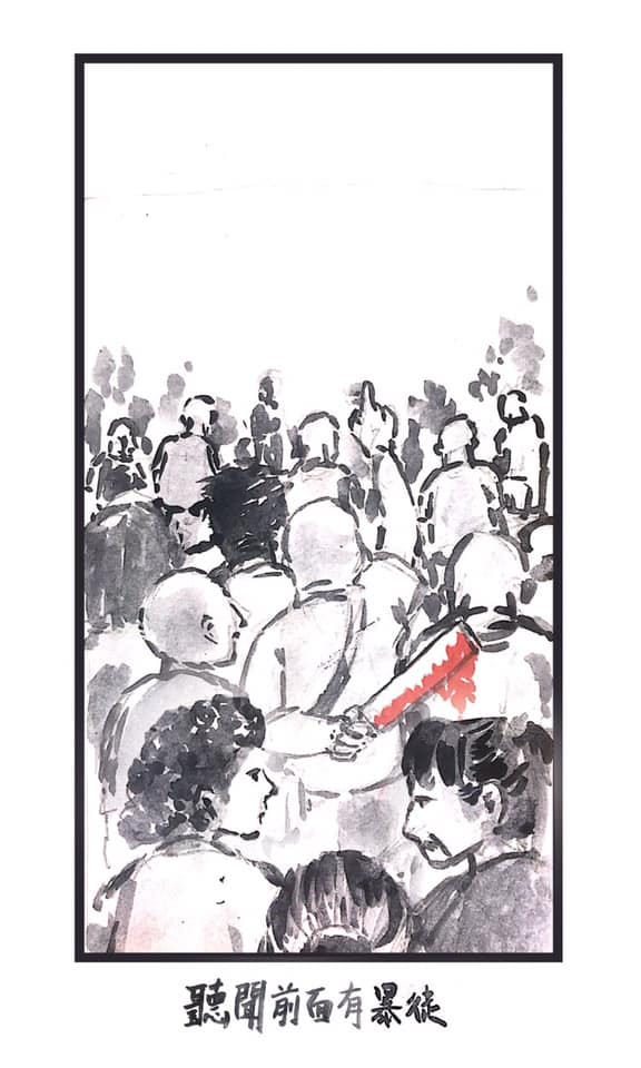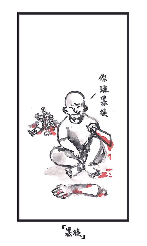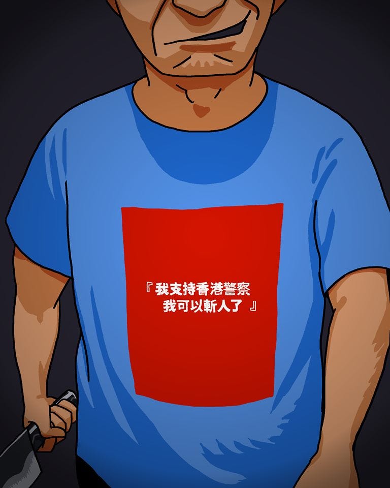 Cuson早已不用介紹了,他這張刻劃「我支持警察,我可以斬人了」,齜牙咧嘴的奸笑,充分地呈現人性之惡。看到此情此景,我們都會忍不住問,為什麼香港竟然出現這種壞人?或許我們不該對人性善良有過高的期待,這也是人類社會改革以來,以法止惡的必要。
