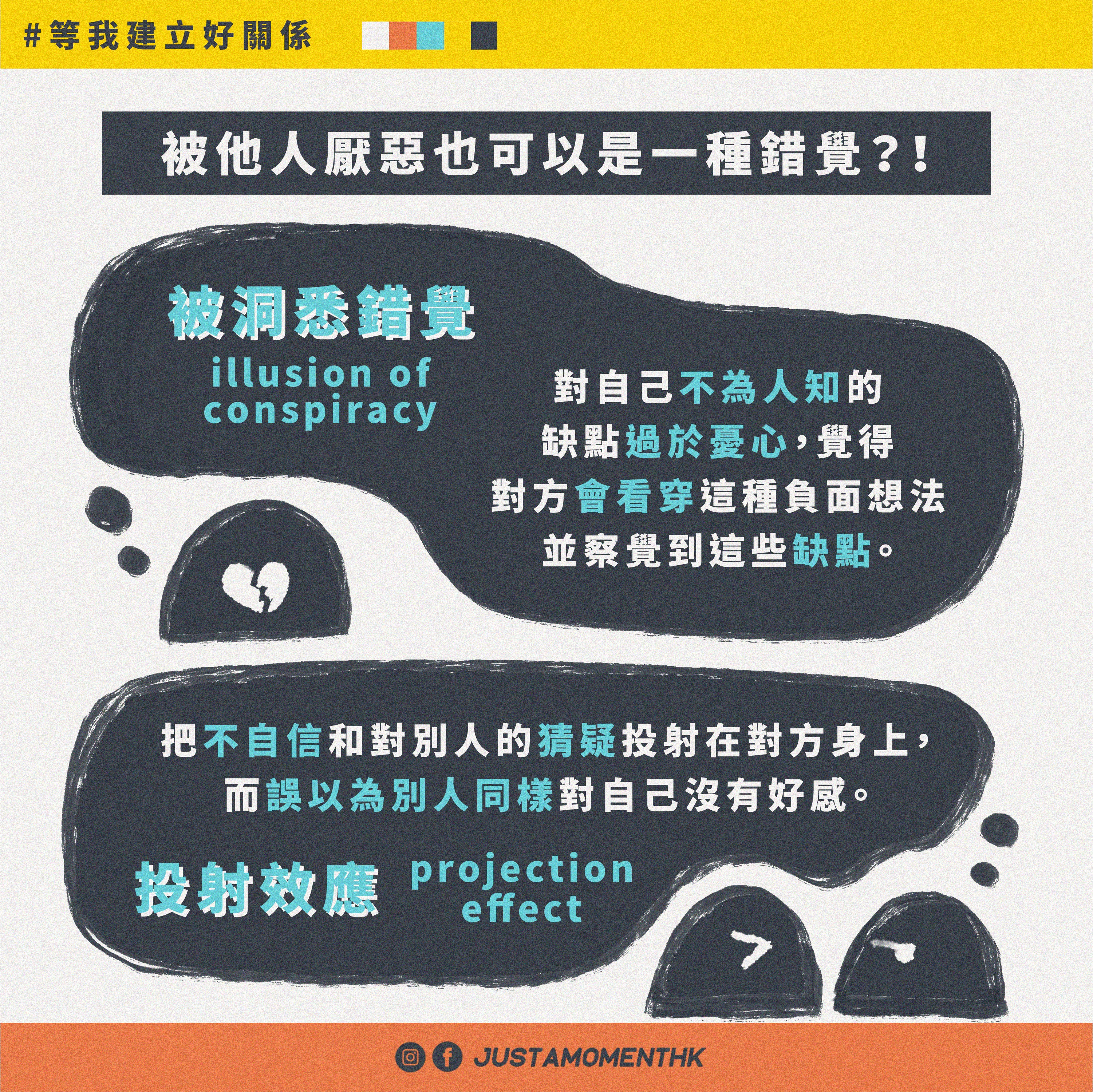 此外,心理學亦有一種現象名為「被洞悉錯覺」(illusion of conspiracy):人會擔心他人從表情、語言等細節讀取自己內心的消極想法,害怕對方注意到自己不為人知的缺點。在投射效應和被洞悉錯覺的影響下,我們感受到的實際厭惡有機會被無限放大,甚至有可能只是子虛烏有。