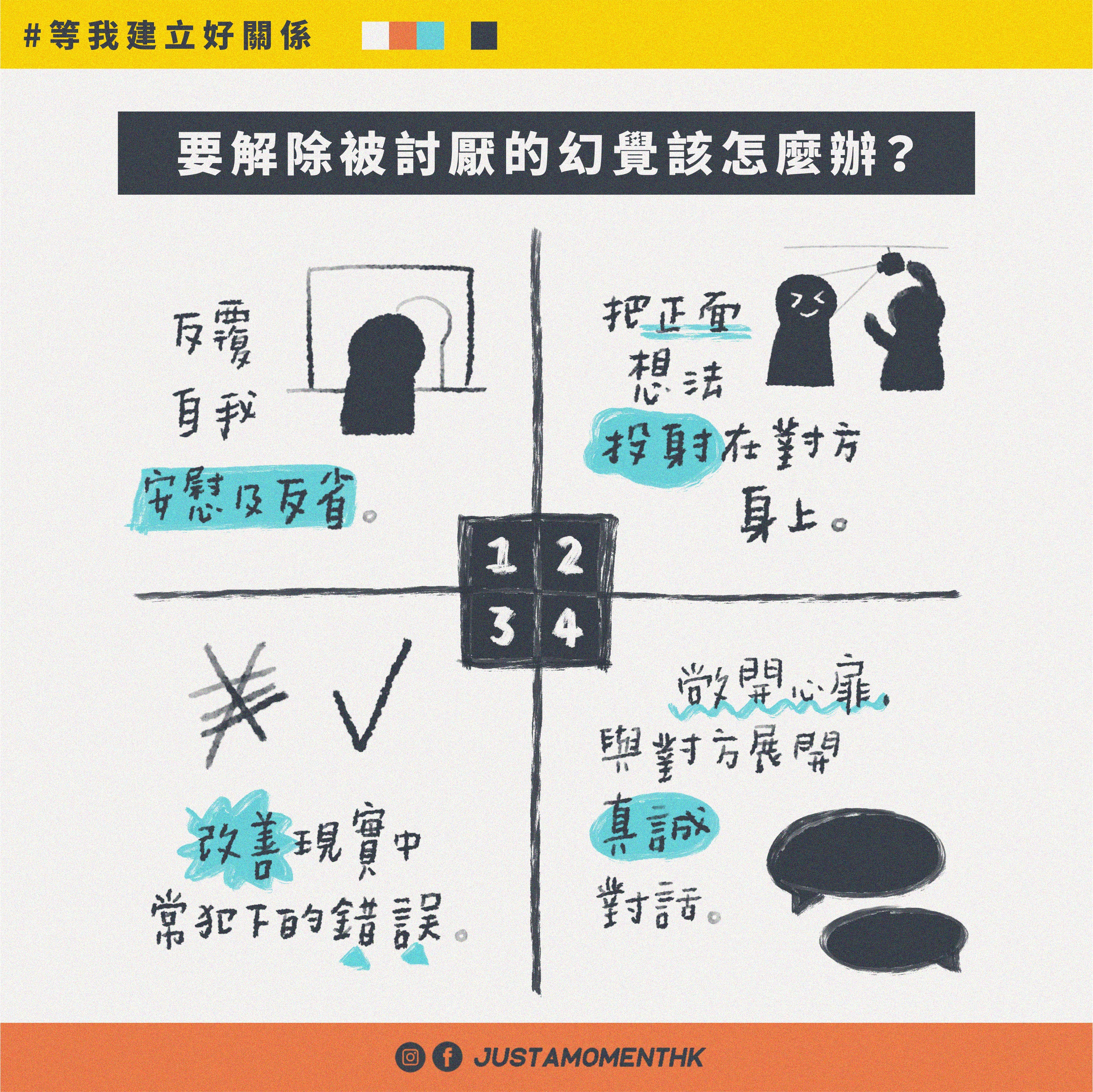被討厭的幻覺人皆有之,而且只要減少猜疑便能消除它帶來的恐懼。如你觀察到自己出現這種負面感覺,也可以反利用投射心理,把正面想法投射在對方身上,提醒自己「待人好,別人也會待你好」的心態並付諸行動,終有一天能讓對方感受到你的善意。