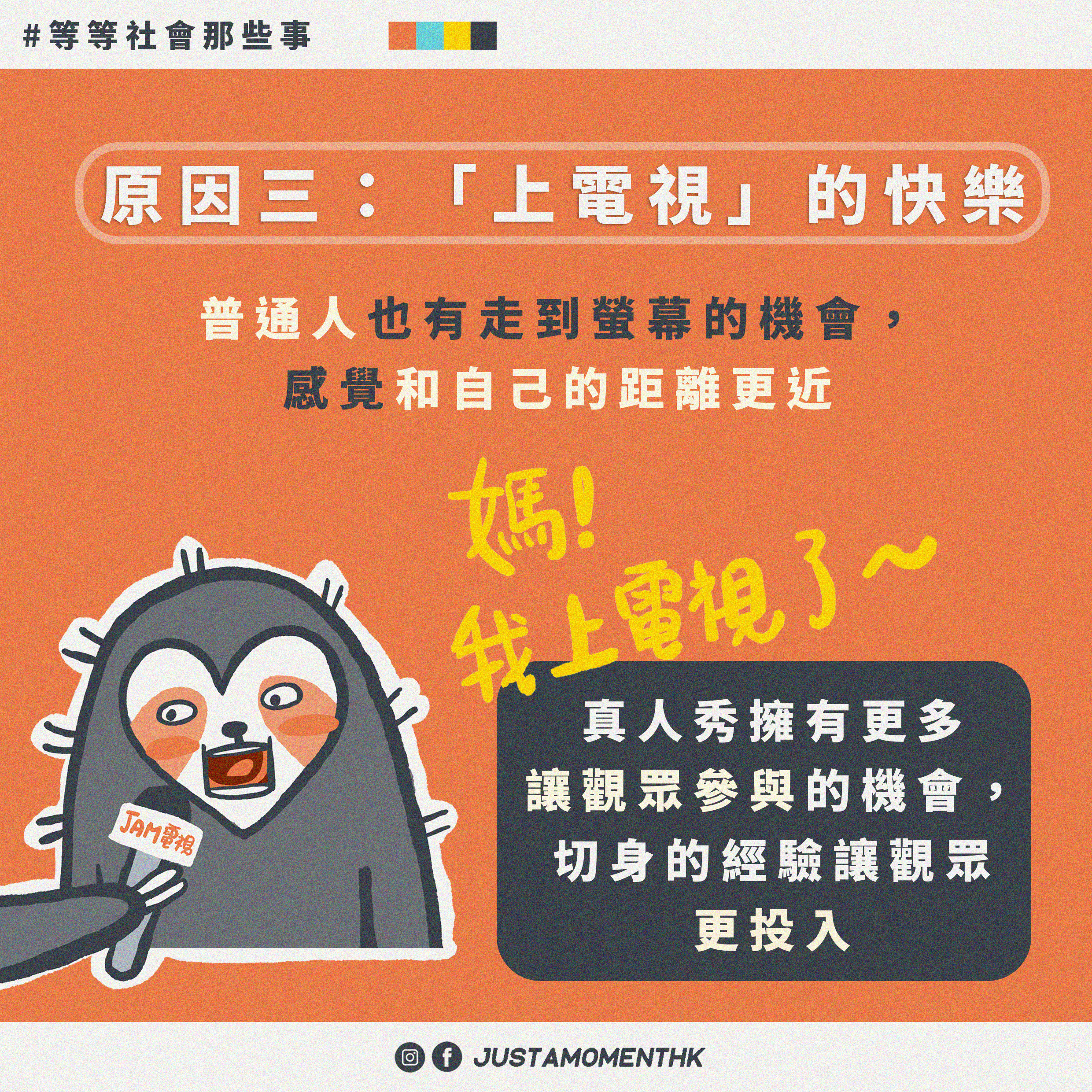 比起一般電視劇,真人秀擁有更多讓觀眾參與的機會,例如選出最喜歡的環節、投票決定冠軍等。這種更切身的經驗讓觀眾更加投入,更願意追看下去。