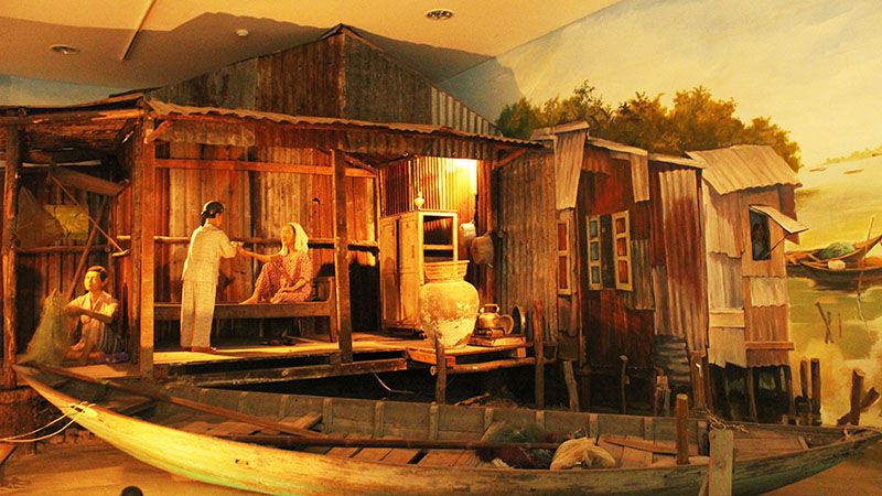 峴港博物館的展品,重現越南傳統艇戶的生活場景。類似文化在南中國海很常見,Wilhelm Solheim稱此族群為Nusantao。