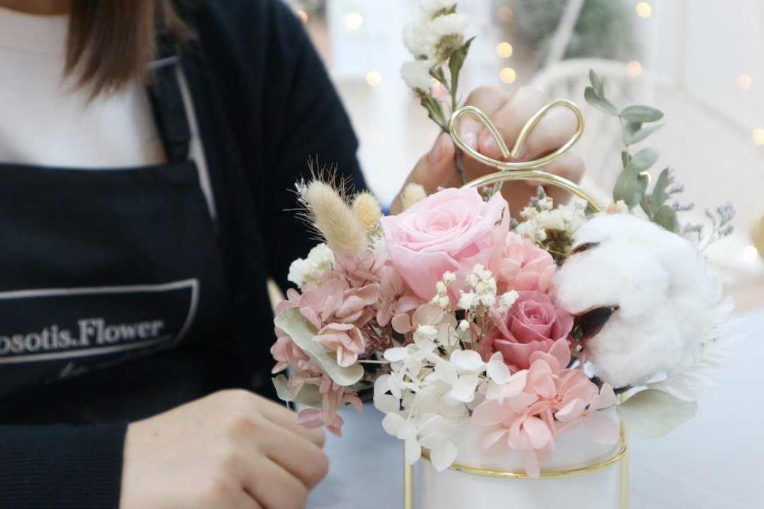 保鮮花與乾花可存放 1-3 年,容易存放及處理。再配上好有質感的金屬花盆,作為家中裝飾品好不錯。