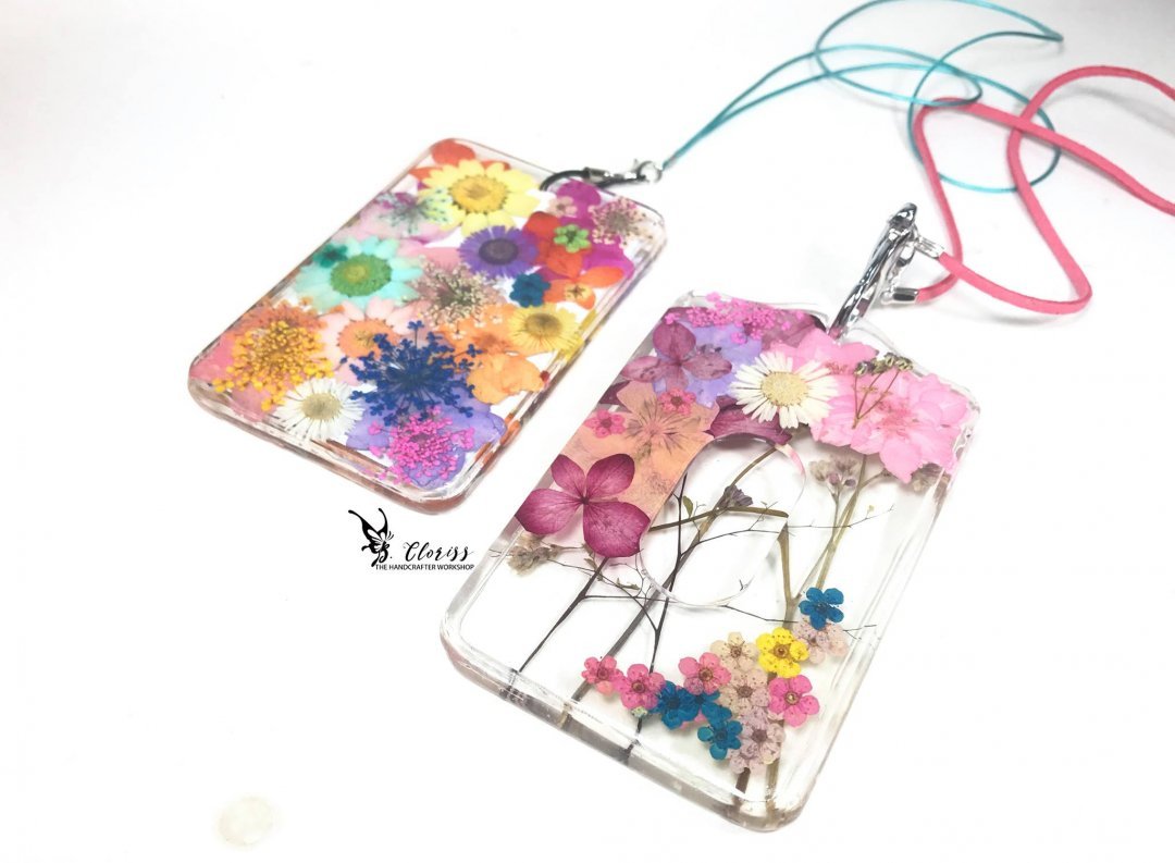 以鮮花經押花器快速抽乾花中的水份, 壓製而成的押花,能保持花的美態和鮮艷的色彩,課堂教授將花配合透明度高的水晶滴膠,製作成各種押花藝術品。