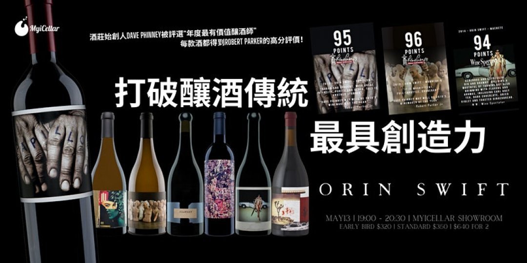 5月13日,MyiCellar有幸邀請到將Orin Swift納入旗下,全球最大的葡萄酒集團E. & J. Gallo Winery,親身和大家一起品鑒Orin Swift系列葡萄酒,各方面的表現都近乎完美,得到Robert Parker的高分評價,打破釀酒傳統且最具創造力的Orin Swift酒莊Collection,豈可錯過?