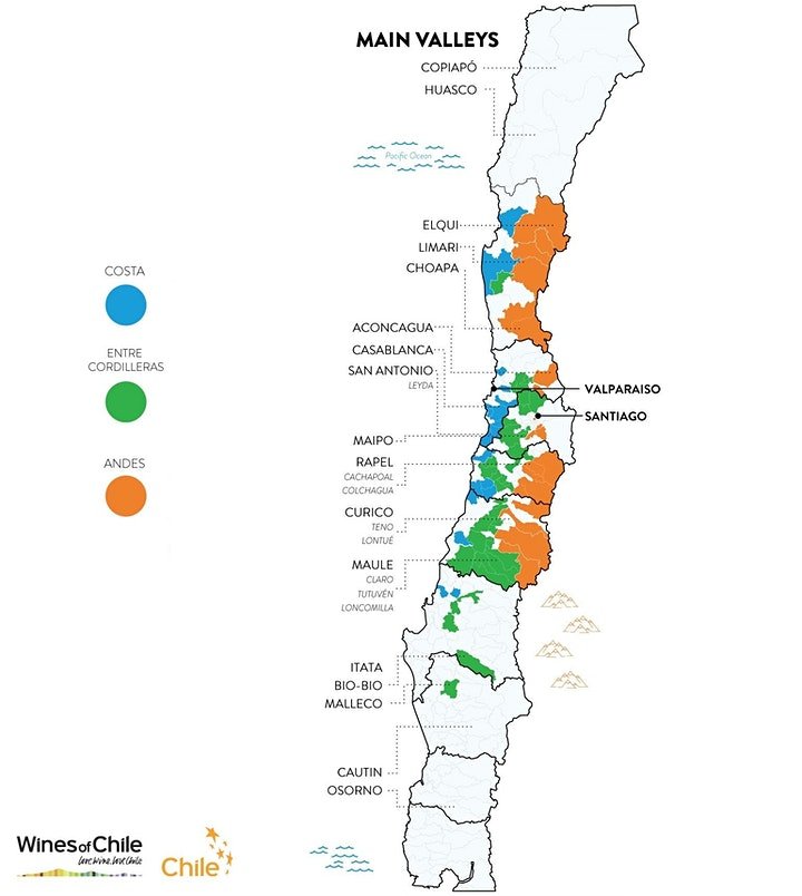 智利葡萄酒多為國際品種,像Cabernet Sauvignon、Merlot、Sauvignon Blanc、Chardonnay等。鄰近海岸,受清涼海風和霧氣影響而較涼的「岸區」(Costa),多種植Pinot Noir、Sauvignon Blanc、Chardonnay等品種;而受山脈保護的「谷區」(Entre Cordilleras),氣候較暖和,多出產較飽滿成熟的葡萄酒,如Cabernet Sauvignon,大部份智利酒都在「谷區」出產;在安第斯山脈山腳附近的「山區」(Andes),日夜溫差大,而且山上冷空氣會向下沉,調節內陸的高溫,出產強勁而帶酸度的美酒。