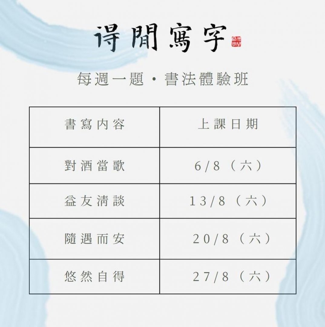 本體驗班針對初學者或零經驗者,以增加輔助線、單鉤法、雙鉤法等,幫助初學者建立書寫信心,享受完成書法作品的成功感。
