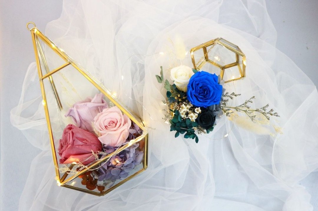 保鮮花與乾花可存放 1-3 年,容易存放及處理。再配上玻璃花房,作為家中裝飾品好不錯,平日看到,都會覺得好開心好甜的。