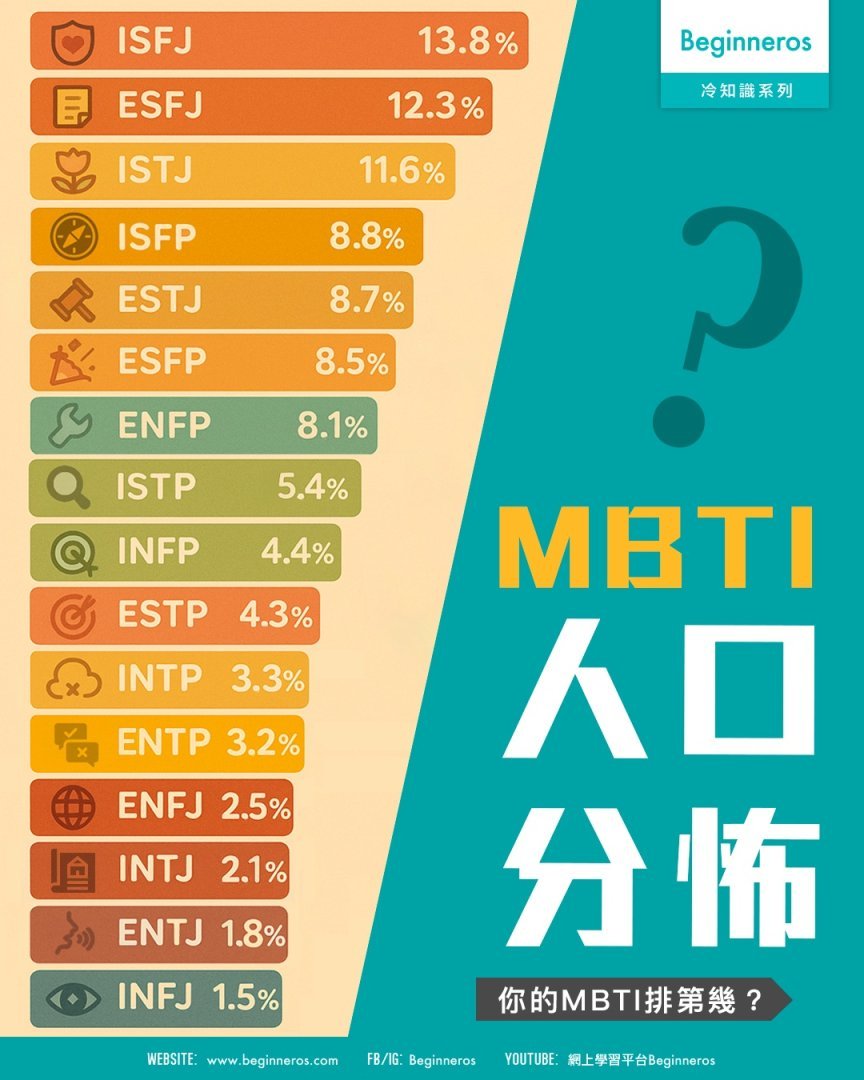 MBTI 在全球越來越流行,許多人甚至會在社交平台標註自己的 MBTI 類型作為自我介紹。那麼,你知道自己的 MBTI 是屬於稀有類型,還是最常見的類型嗎?