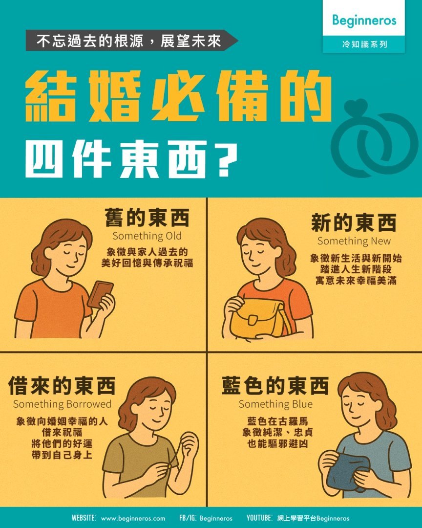 這是一個源自18世紀英國 的婚嫁傳統。傳說只要新娘在婚禮當天身上帶齊四件東西,就能帶來幸福婚姻,它們也有各自的象徵意義: