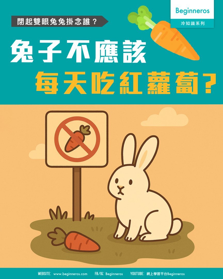 但現實世界裡的兔子,不應該每天吃紅蘿蔔。紅蘿蔔雖然香甜可口,但含糖量偏高,對兔子的腸胃來說,紅蘿蔔就像是「零食」,就像人類偶爾吃一包薯片或朱古力,開心可以,但不可能當正餐。