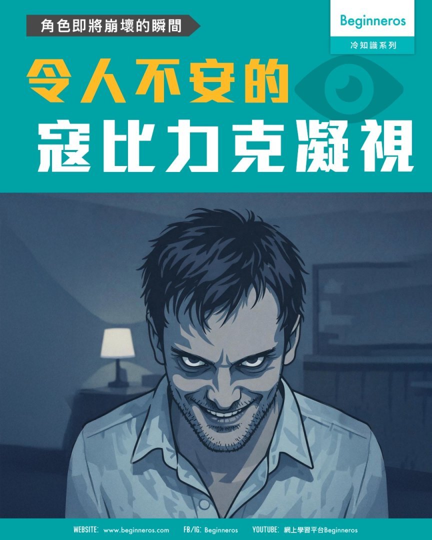 所謂寇比力克凝視,指的是角色微微低頭,讓眉線壓低,雙眼卻向上直視鏡頭,有時還會配合僵硬或不自然的笑容。這種姿態看似簡單,卻會令人本能地感到不安。