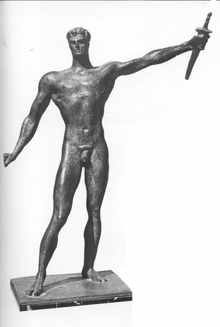 第一張圖是Breker作品 “Sword Carrier”(fig.2),創作於1938年。Breker的創作主題多以年輕的男性裸體為主,活靈活現地將希特勒藝術綱領中所說 “the good, the beautiful, and the healthy” 在日耳曼族這個Master Race的身體上呈現出來。看看這個雕像的身體比例,對比起一個傳統古希臘或羅馬(Greco-Roman)的古典人體雕塑,你大概會覺得這和頭身比例實在太理想化,或太誇張了。雖然說,這個雕像應用了古典雕塑的對立式平衡(contrapposto)站姿,即是將重心置於一隻腳上,但視覺上你仍然覺得Breker這個雕像的動作比較生硬、肌肉很繃緊、手勢向外擴張充滿強勢的張力。其中一個導致人物缺乏動感的原因,大家可以留意他的面部表情:就是沒有什麼表情,沒有什麼個人特徵。即是是裸體,這裡也絕對看不到什麼「性感」或惹來情感上對這個「完美身體」的傾慕感情,因為這個身體就是一個「日耳曼標準」的模特兒而已,他代表國家、代表種族,並不需要包含什麼個人情緒和性慾啊。