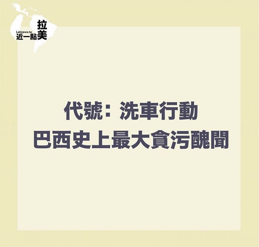 「洗車行動」 — 是一場以巴西國營的石油公司 Petróleo Brasileiro S.A. 為核心的貪汙醜聞,驚動商界及政壇,許多政治人物及商界大佬遭逮補,讓社會陷入反政府示威暴動及政治動盪。