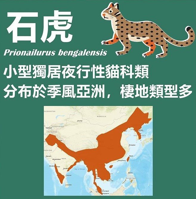 從熱帶雨林到針葉林、草原氣候到近水源的肥沃地帶,甚至是三千多公尺高的山地,都可能見到石虎的蹤影。