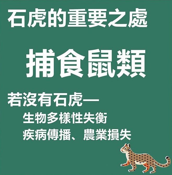 而石虎們為什麼那麼重要呢?就是因為牠在食物鏈中扮演高階消費者的角色,尤其在「控制鼠類數量」的方面扮演著重要的角色。