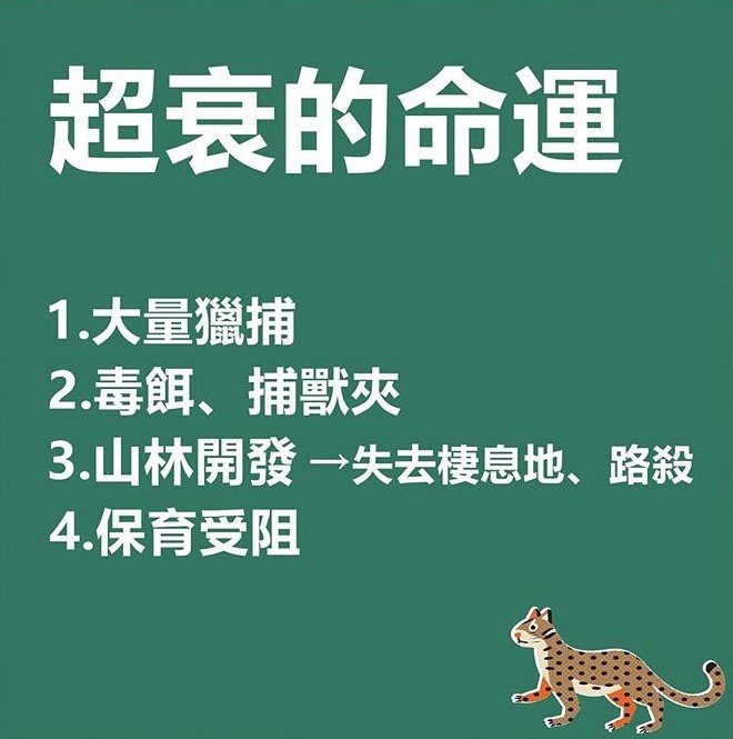 但近年來,雲豹在台灣幾乎被認定為絕跡了,僅剩下石虎一種,目前正面臨瀕臨絕種的危機。