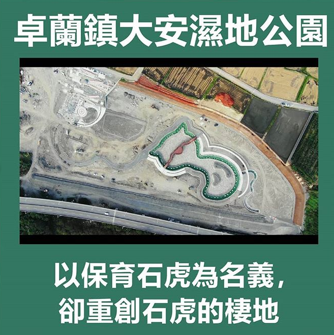 全國水環境改善計畫的「卓蘭鎮大安濕地公園」,以打造石虎生態棲地為名義投入大筆預算,不料此建設未經生態環境影響評估(環評),且將石虎所棲息的灌木全數移除、重創石虎的棲地。