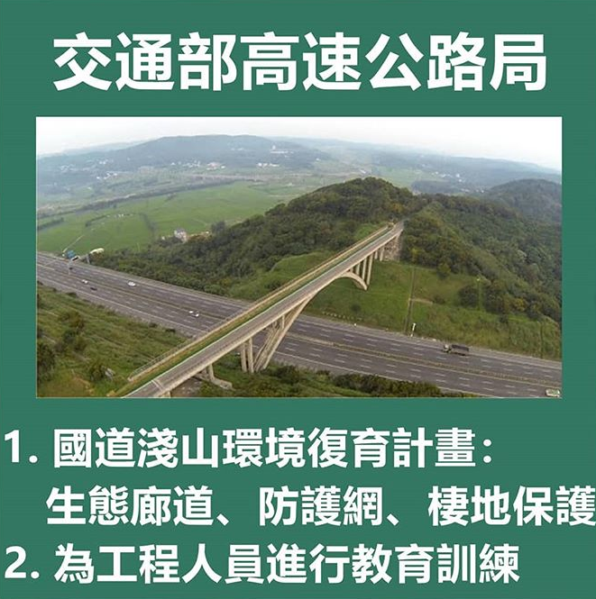 c.國道淺山環境復育計畫:進行路權棲地改善、動物通道和防護網設置,期待國道綠廊可作為石虎的重要庇護所。