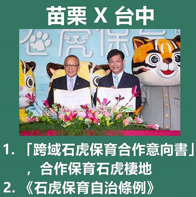 b.「石虎的棲地無法以縣市分界。」台中市長林佳龍以此點出跨縣市合作保育的重要性,苗栗縣與台中市政府簽署「跨域石虎保育合作意向書」,宣示積極合作保育石虎棲地。