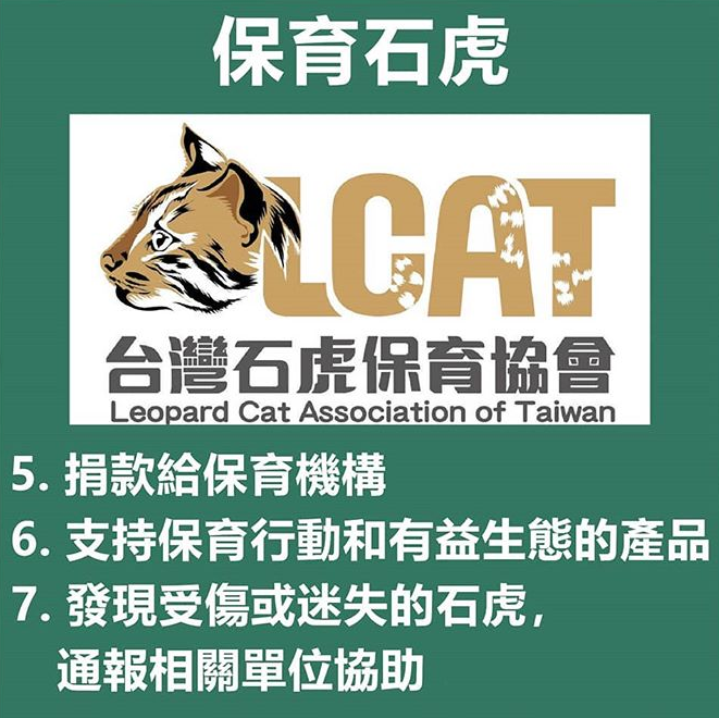 5. 捐款給相關保育機構,例如農委會特有生物研究保育中心、屏東保育類野生動物收容中心、臺北動物保育教育基金會石虎專戶等等