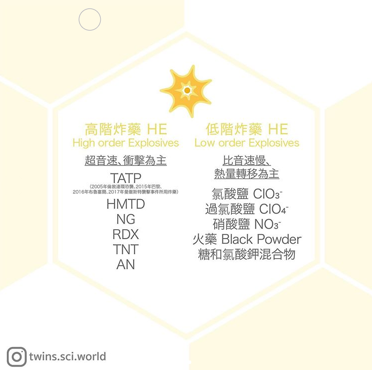 眾多高階炸藥裡,以三過氧化三丙酮(Triacetone Triperoxide, TATP)較廣為人熟悉,2005年倫敦連環恐襲、2015年巴黎、2016年布魯塞爾、2017年曼徹斯特襲擊事件,以及2014年香港仔炸彈案都是以此為炸藥。TATP成份簡單,主要為丙酮(acetone)和雙氧水(hydrogen peroxide),可見於家居化學品,製作過程亦不複雜,然而穩定性極低,很易便能引爆,且能造成相當大的殺傷力,因此常被用於恐怖襲擊。其他高階炸藥還包括六亞甲基三過氧化二胺(Hexamethylene triperoxide diamine, HMTD)(同樣高爆炸性及對物理衝擊、摩擦及火焰極為敏感,很易引爆)、硝酸甘油(Nitroglycerin, NG)(著名化學家諾貝爾發明的矽藻土炸藥主要成分)、黑索金(Cyclotrimethylenetrinitramine/ Research Department eXplosive, RDX)和三硝基甲苯(又名黃色炸藥,2,4,6-trinitrotoluene, TNT)等。