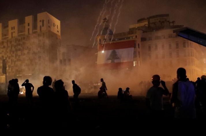 在黎巴嫩貝魯特爆炸後的示威中,警察向示威者發射催淚氣體。