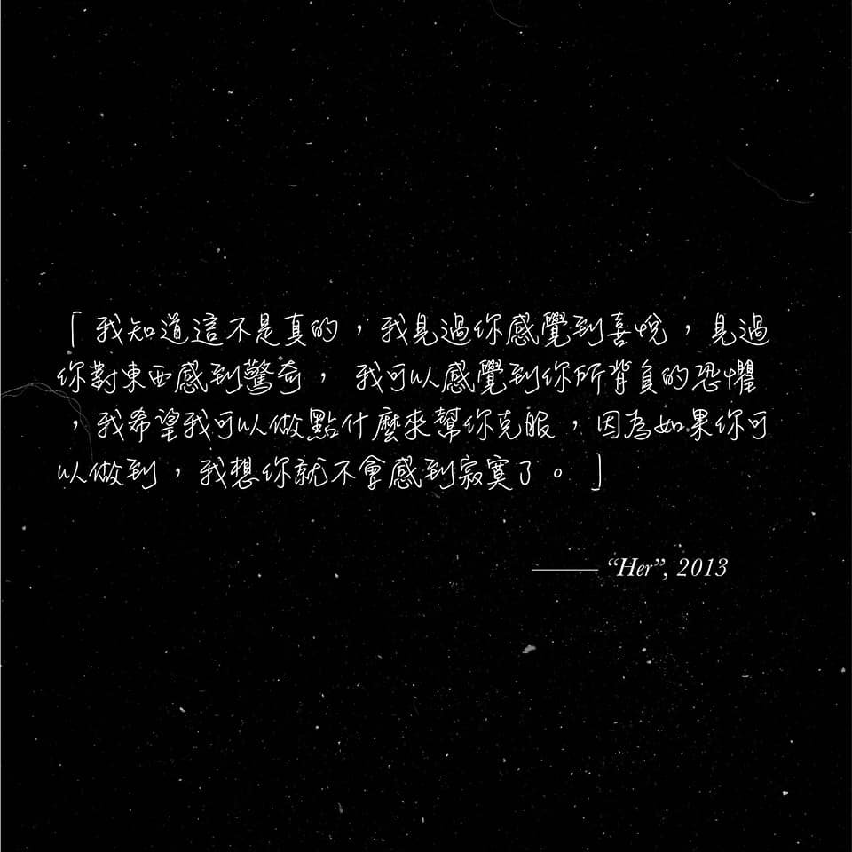 Her《雲端情人》的上映,講述着定位於住在未來世界的城市中受別人委託撰寫溫馨的私人信件給情人、親人維生的男人-Theodore,在他飽受將結束一段婚姻而迷惘時,他在購買了最新科技的聲控電腦系統,邂逅了人工智慧(AI)-Samantha,及發展至愛情。電影雖然帶出了人的生活與科技漸交疊的思考,但更重要是引出了孤獨的命題。