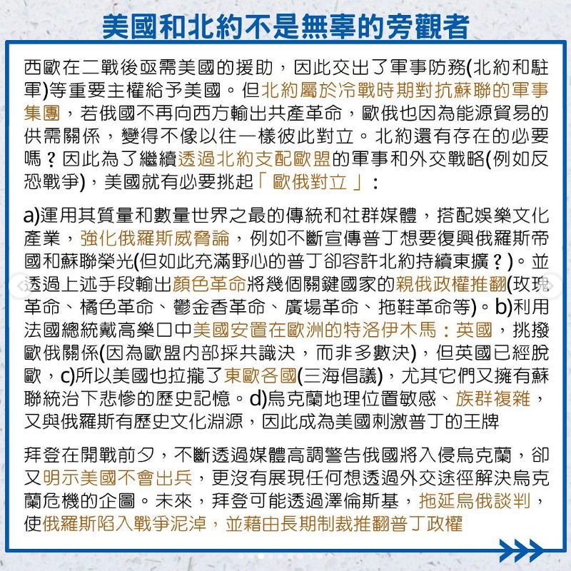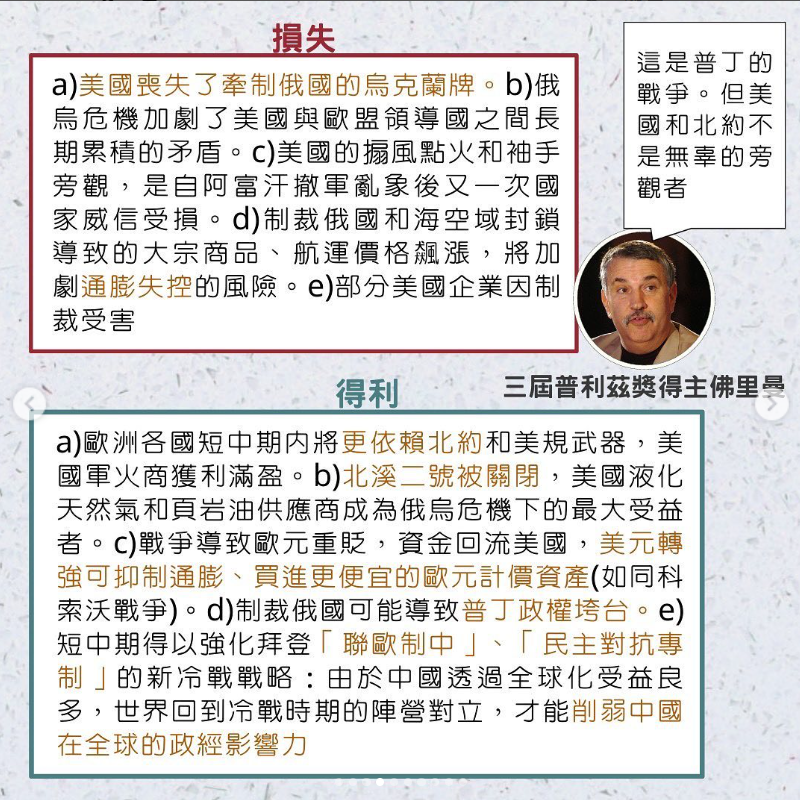有人曾問,為何要站在一個專制獨裁國家的角度去看俄烏戰爭?我想季辛吉或許早已給出答案。站在敵對國家立場看事情,並非代表叛國,而是為了釐清雙方的歧見,避免不必要的誤解和爭端,防止人類透過戰爭走向自我毀滅