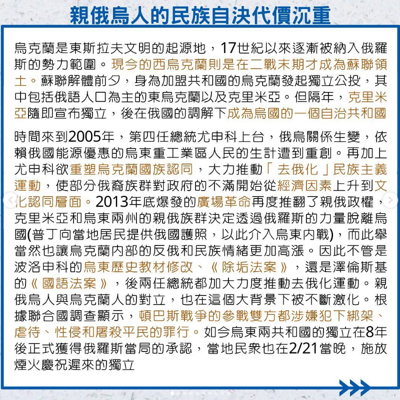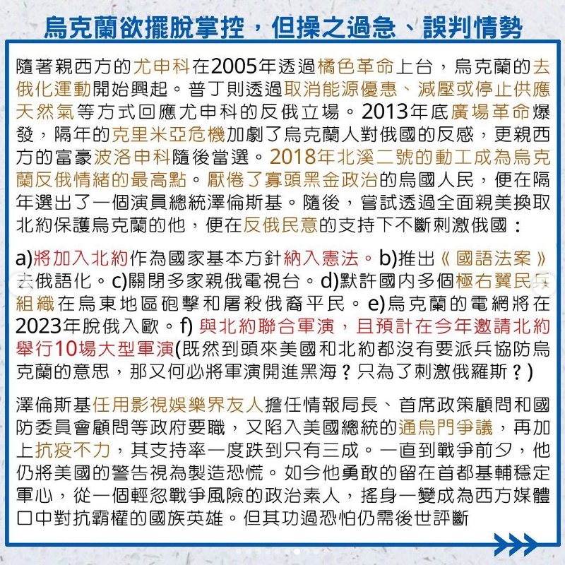 c) 西方必須明白,對俄羅斯來說,烏克蘭絕不可能只是一個外國。俄羅斯的歷史、文化和宗教都始於基輔羅斯。幾個世紀以來,烏克蘭一直是俄羅斯的一部分。甚至連蘇聯領導人赫魯雪夫都來自烏東頓巴斯地區(這可能也解釋為何他要將克里米亞送給當時蘇聯的衛星國之一烏克蘭)。比起蘇聯,俄羅斯已不再是個”強權”國家了,他擁有很多核武,但軍隊戰力一直在弱化,人口也逐漸老化。俄羅斯希望被尊重,尤其是歷史情感這方面(不只烏克蘭,東歐國家也有許多俄羅斯移民,但他們在國內時常遭到歧視和打壓)
